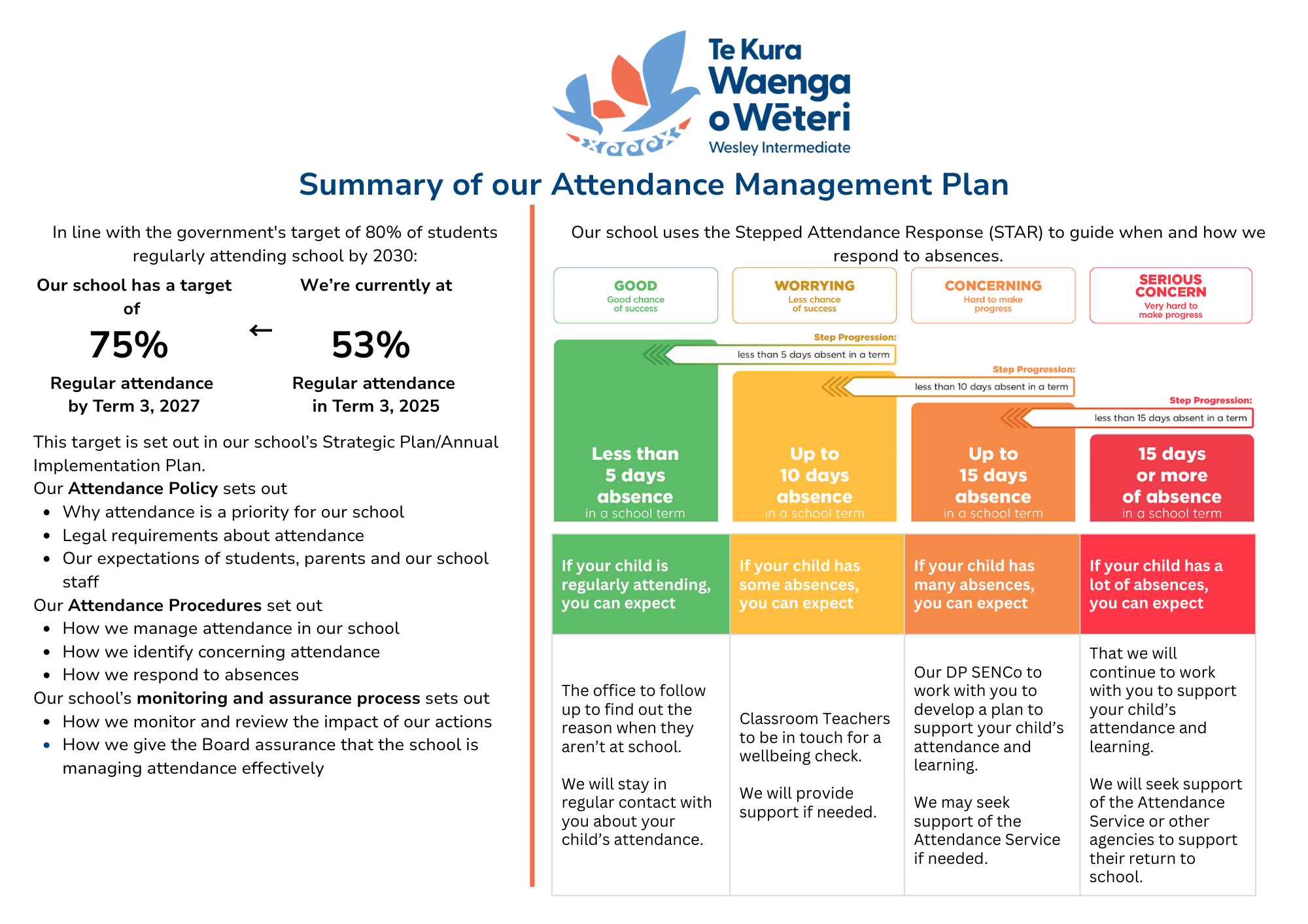 Our school vision, 'Nurturing ākonga to belong, learn and thrive,' guides our approach to attendance and engagement. Regular attendance is essential for learning success, wellbeing, and belonging.